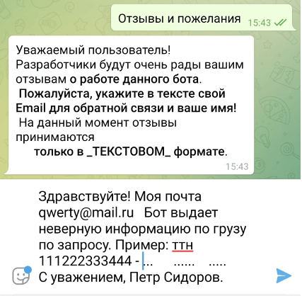 При корректно заданном номере бот выдаст ответ о последнем событии с грузом: