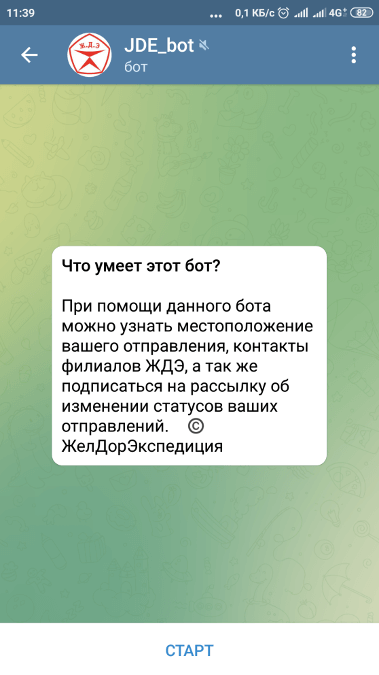 Данный чат-бот предназначен для быстрого и удобного получения клиентом ЖелДорЭкспедиции сведений о текущем местоположении отправления и контактах филиалов ЖДЭ.